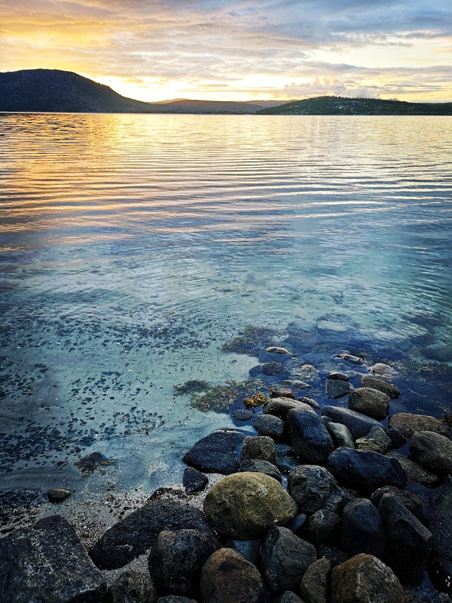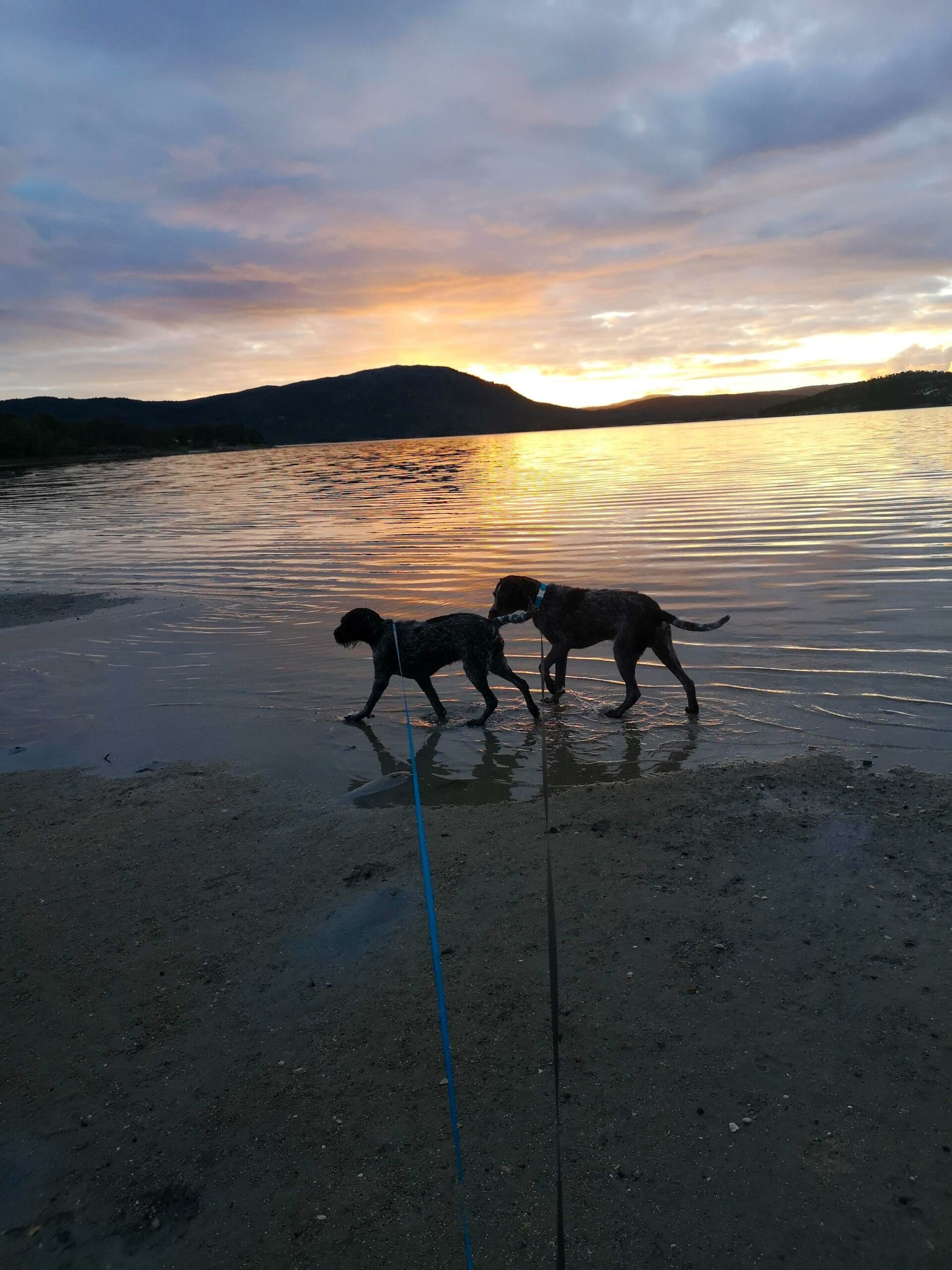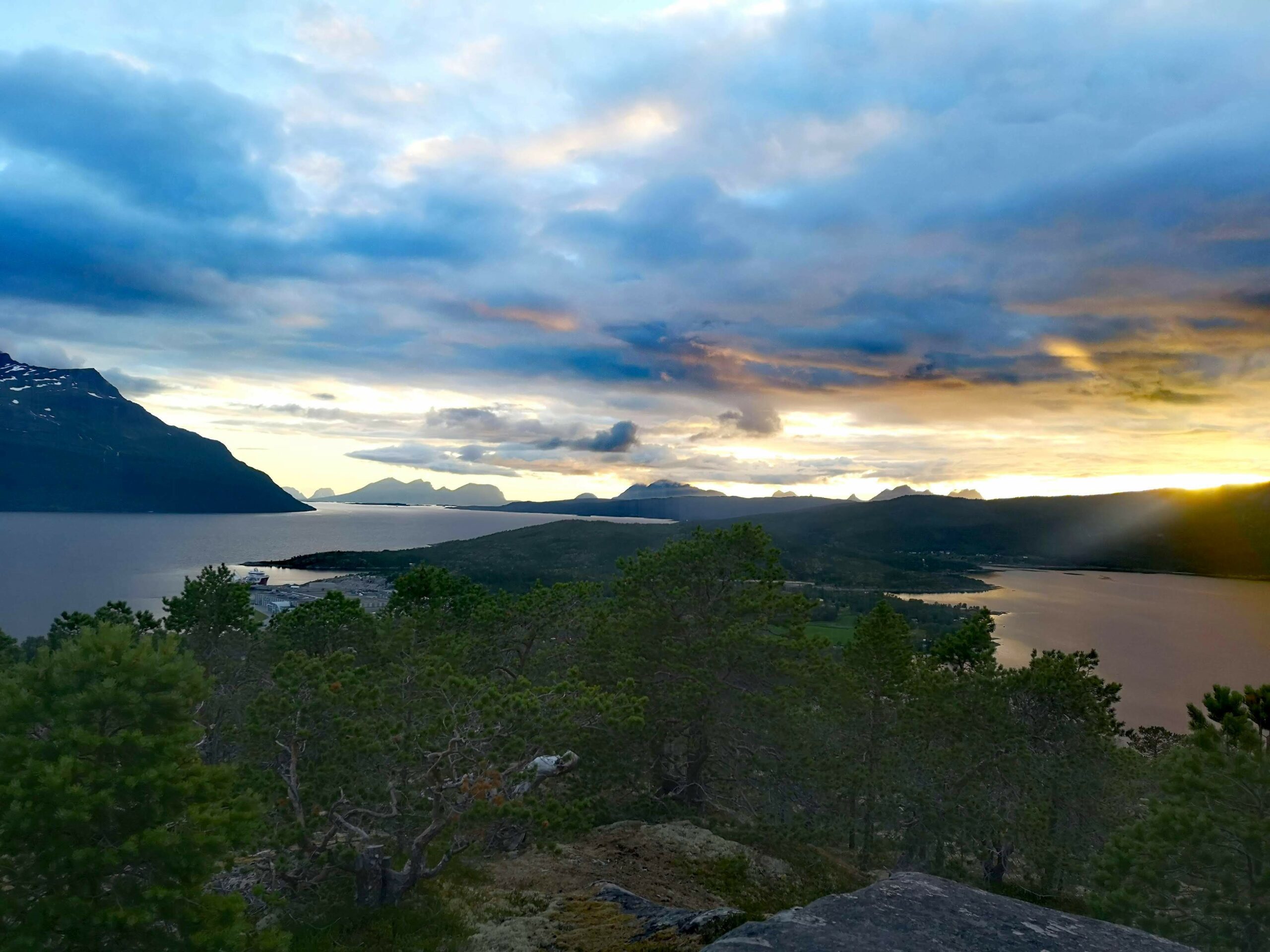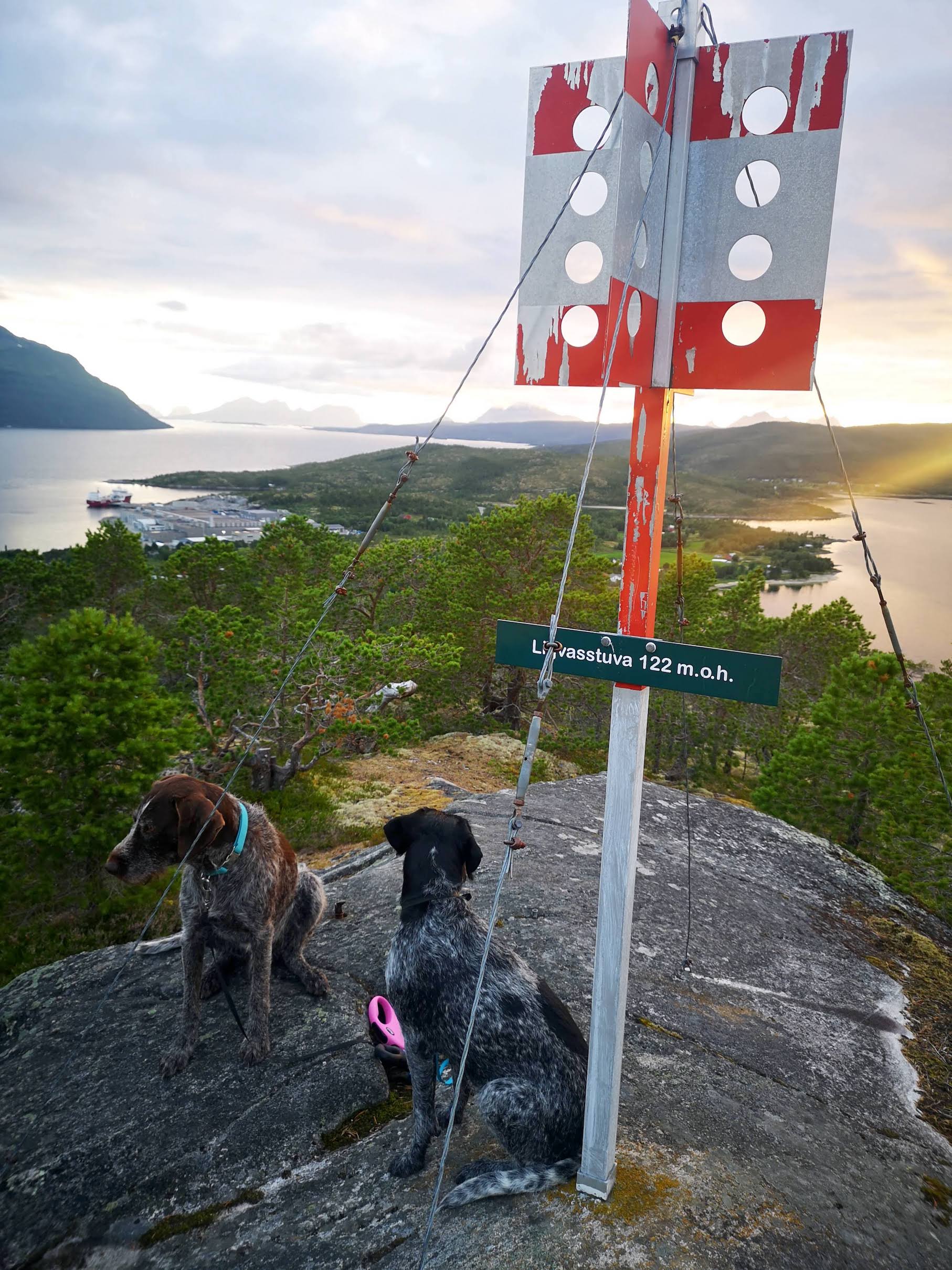 I tillegg til god mat og veldig hyggelig personell, ligger hotellet perfekt til for fotturer i skog og langs fjæra. Hundene og jeg tok dessuten en liten topptur til Litjevasstuva, 122 meter over havet. Herfra så vi solnedgangen over Skrova og Nord-Lofoten. Forøvrig var dette den første solnedgangen etter nesten tre uker med midnattssol i Tromsø og i Nordland på tur nordover.