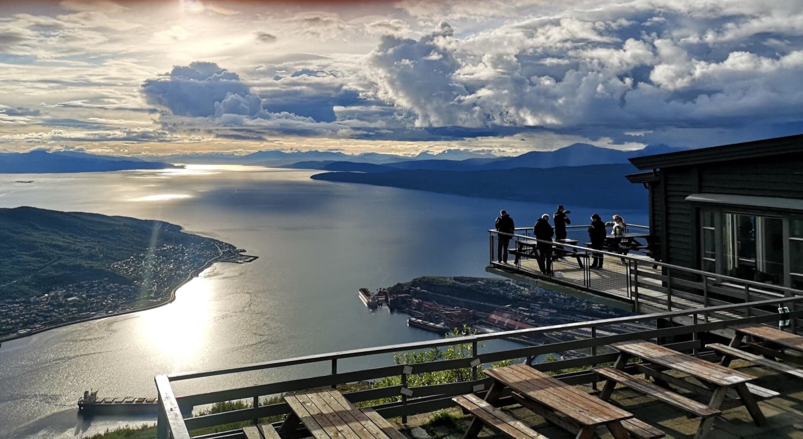 Utsikten fra toppen av heisen når langt ut til Lofoten i sørvest, og opp til fjellene i Troms mot nord.