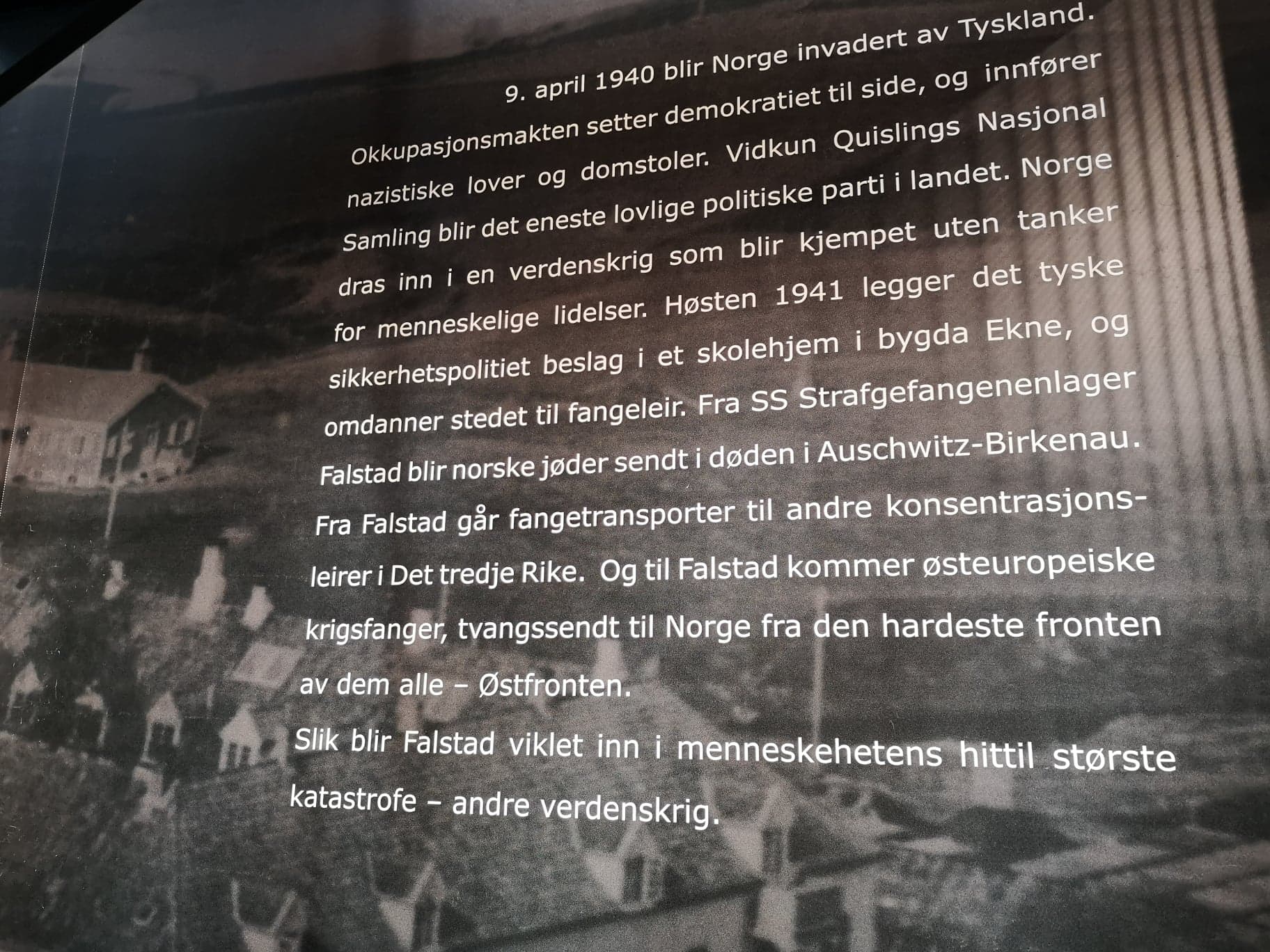Høsten 1941 legger det tyske sikkerhetspolitiet beslag i et skolehjem i bygda Ekne, nord i Trøndelag. De omdanner skolehjemmet til fangeleir, og sender norske jøder til Auschwitz- Birkenau. Samtidig tvangstransportes krigsfanger fra Øst-Europa til det som nå er Falstad fangeleir.