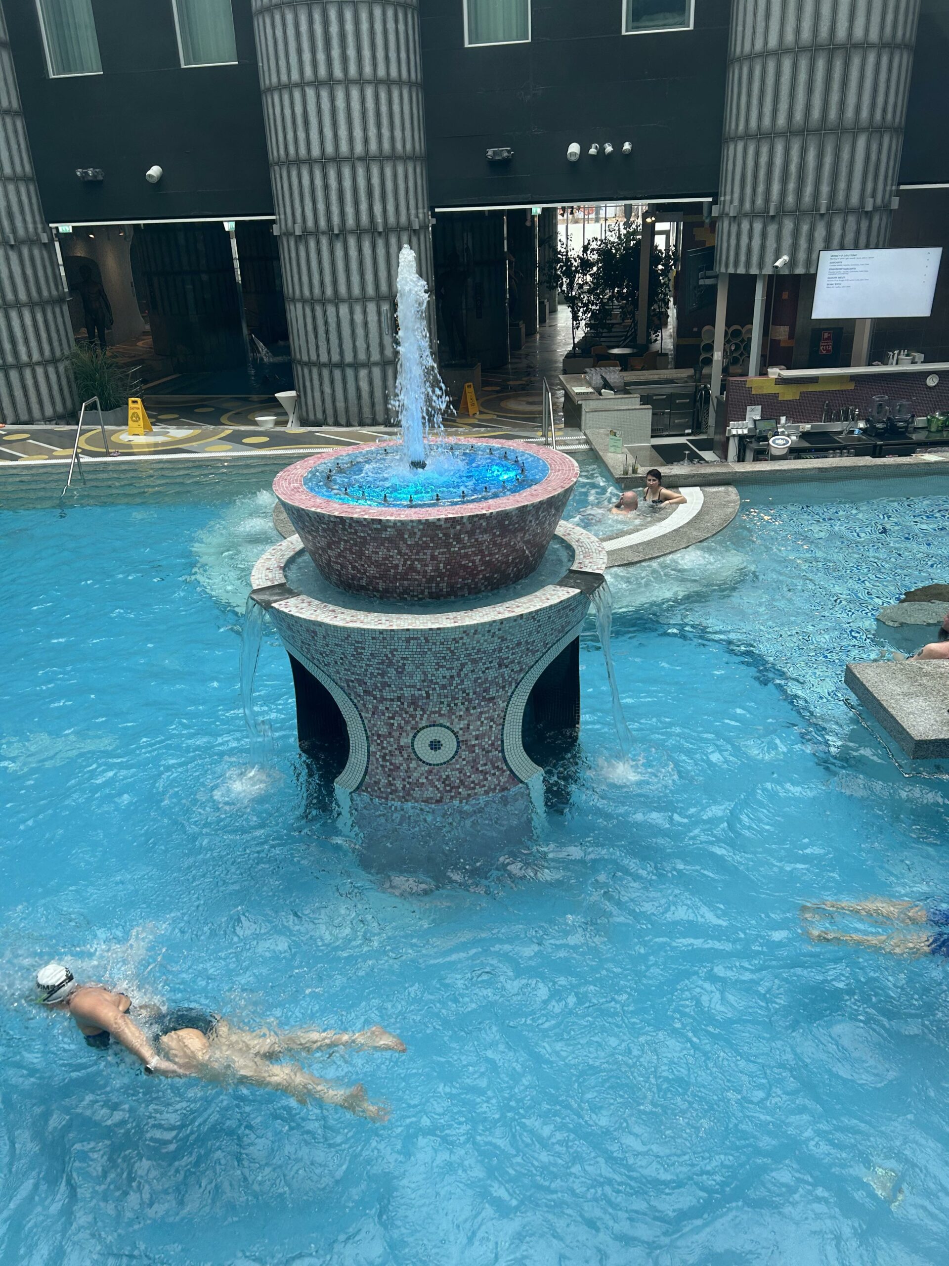 Fra hotellet er det kun et par hundre meter til svømmearenaen, som består av et 25 meters havbasseng med flytebrygger rundt, samt flere badstuer og tribuner på land.