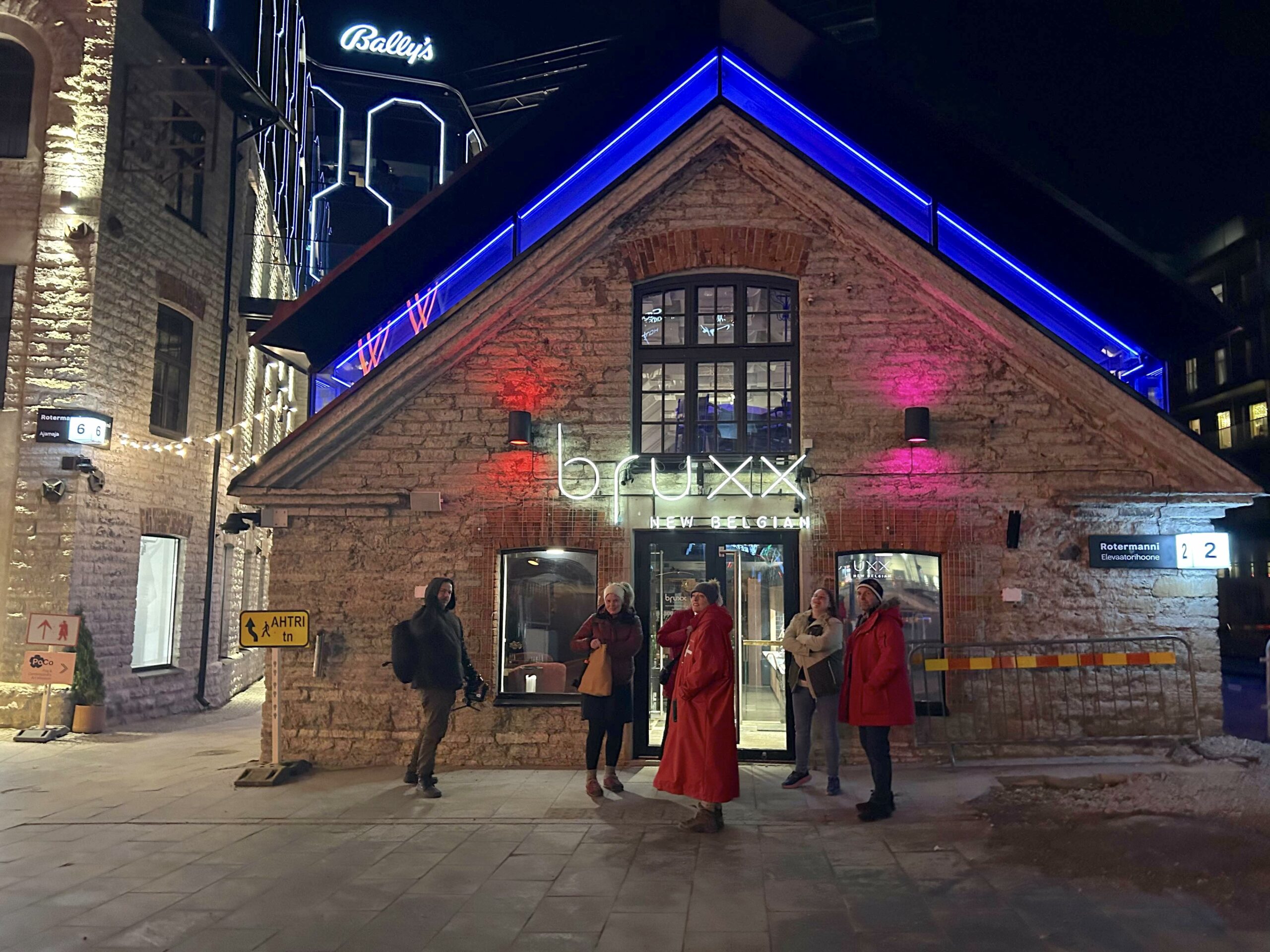 BELGISK: Her er vi på vei ut fra restauranten Bruxx i Rotermanns-kvartalet. Ok mat, men serveringen var veldig treg, til tross for at gruppen vår nesten var de eneste gjestene og vi hadde forhåndsbestilt rettene etter oppfordring fra restauranten.