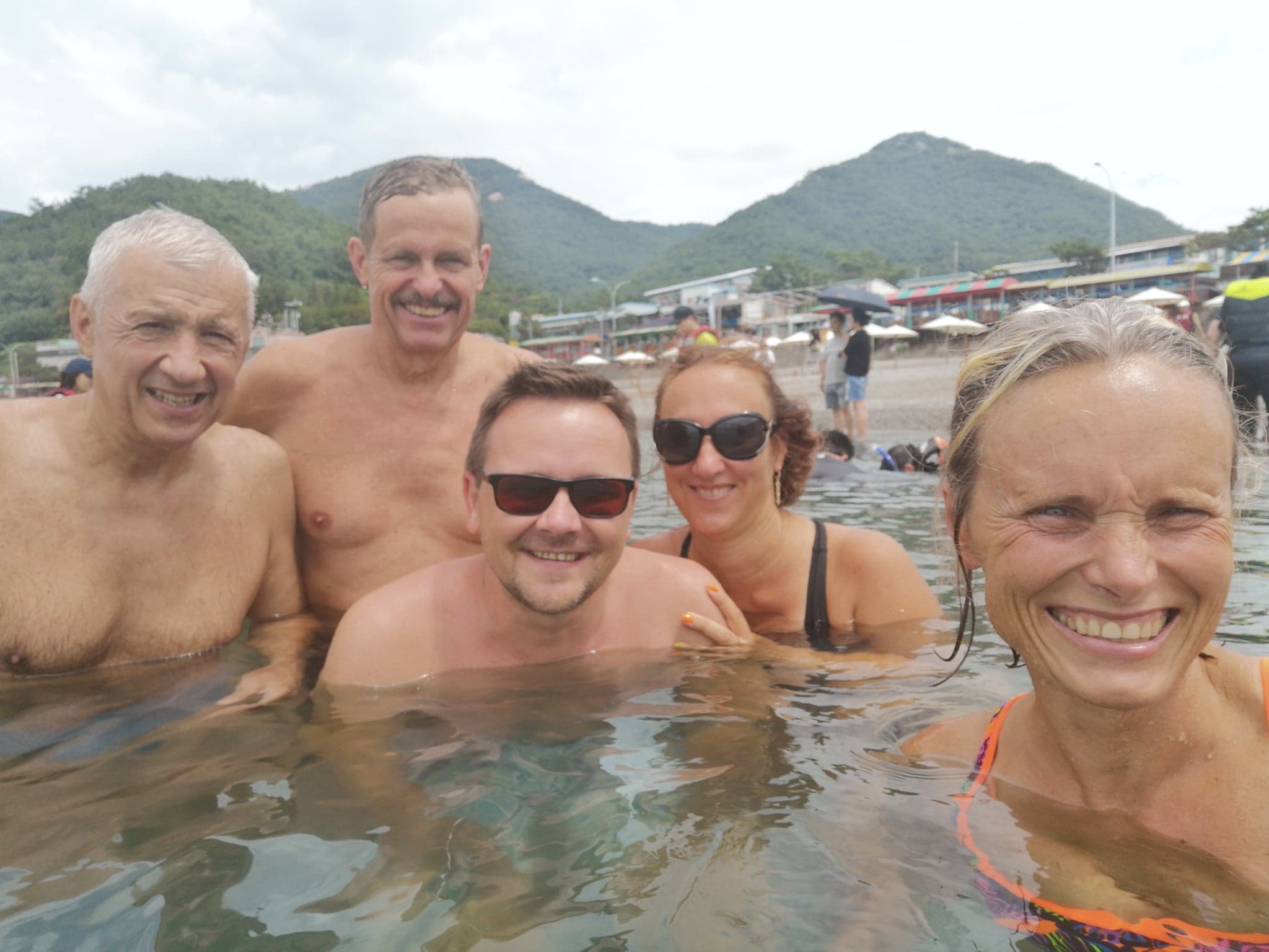Vi skjønte ikke et kvekk koreansk, men la likevel vår stolthet og interne ære i å bade så lenge vi kunne uten vest, inntil badevakten kalte oss vennlig inn og delte ut en rød badevest til hver av oss. Men nei, det var ikke for å være vrang at vi forsøkte å omgå regelen. Men vi er vant til individuell frihet, under ansvar. For dette har stort sett funket hjemme de siste 75 årene.