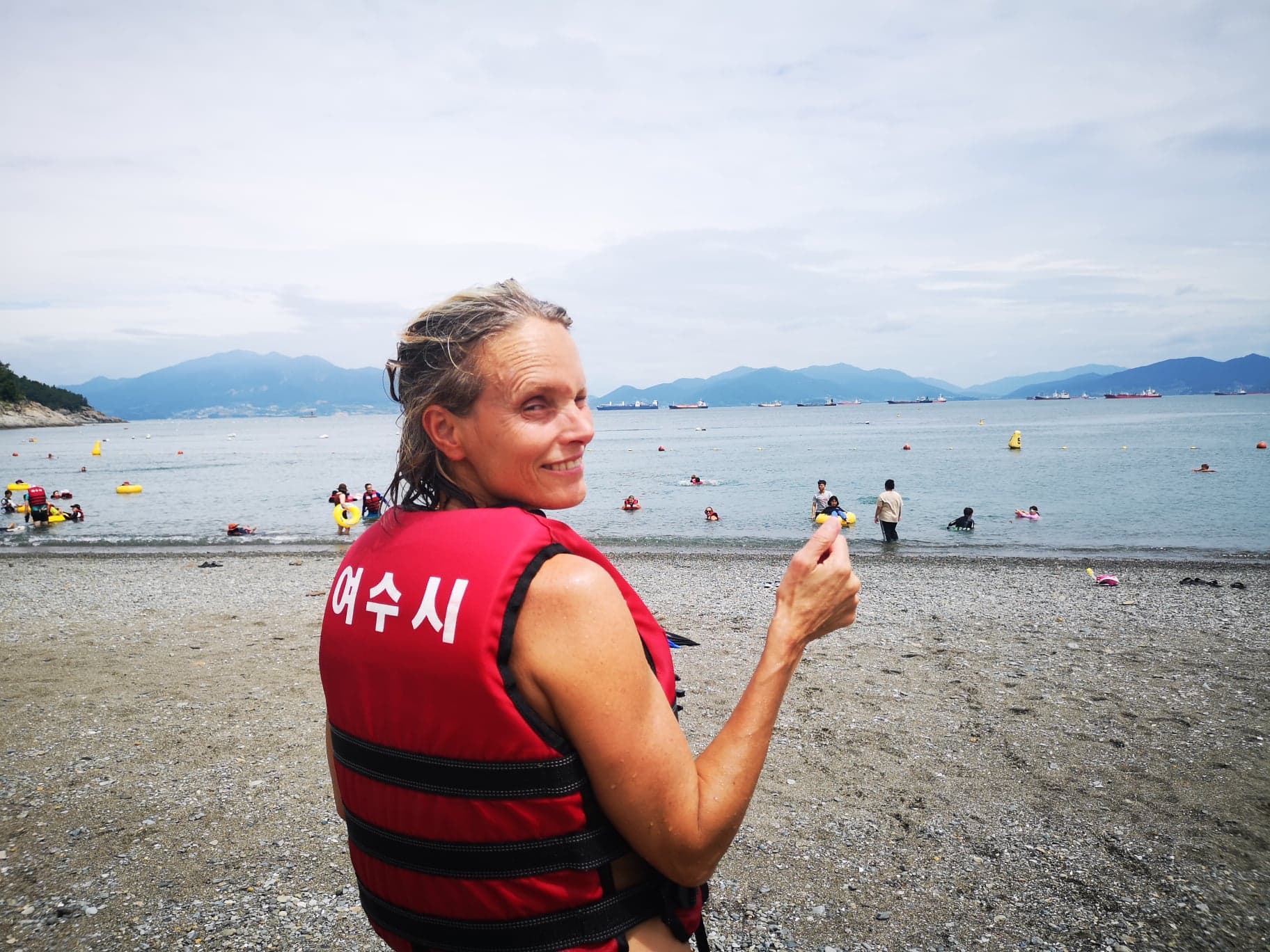 Da vi svømmerne hadde en dag fri og dro på stranden i Yeosu helt sør i landet, ble vi bedt om å ta på oss redningsvester for å bade. Ingen vest, ingen svømmetur. Basta. Mine venner argumenterte med at vi deltok i svømme-VM og dermed kunne svømme. Dette var av null betydning her. Faktisk var sølvvinneren i min klasse på 200 bryst fra vertslandet. Hun ville også måtte ha på seg vest om hun hadde reist på stranden å bade. Dette syntes vi ar så festlig at vi tok det opp video. Fire europeiske svømmere på rekke i butterflystil med vest…Litt av et syn!