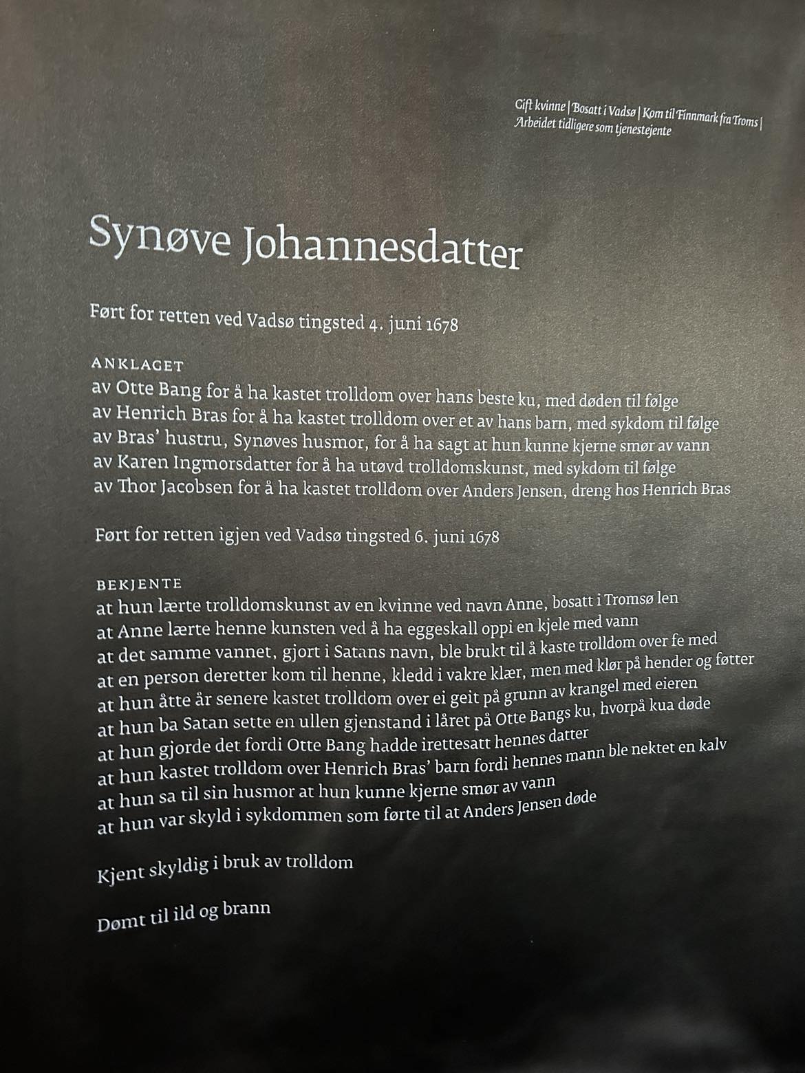 Finnmark ble rammet hardt under hekseprosessene på 1600-tallet, og de 91 minnetavlene i den mørke gangen vitner om at det ikke skulle mye til for å bli dømt til bålet.
