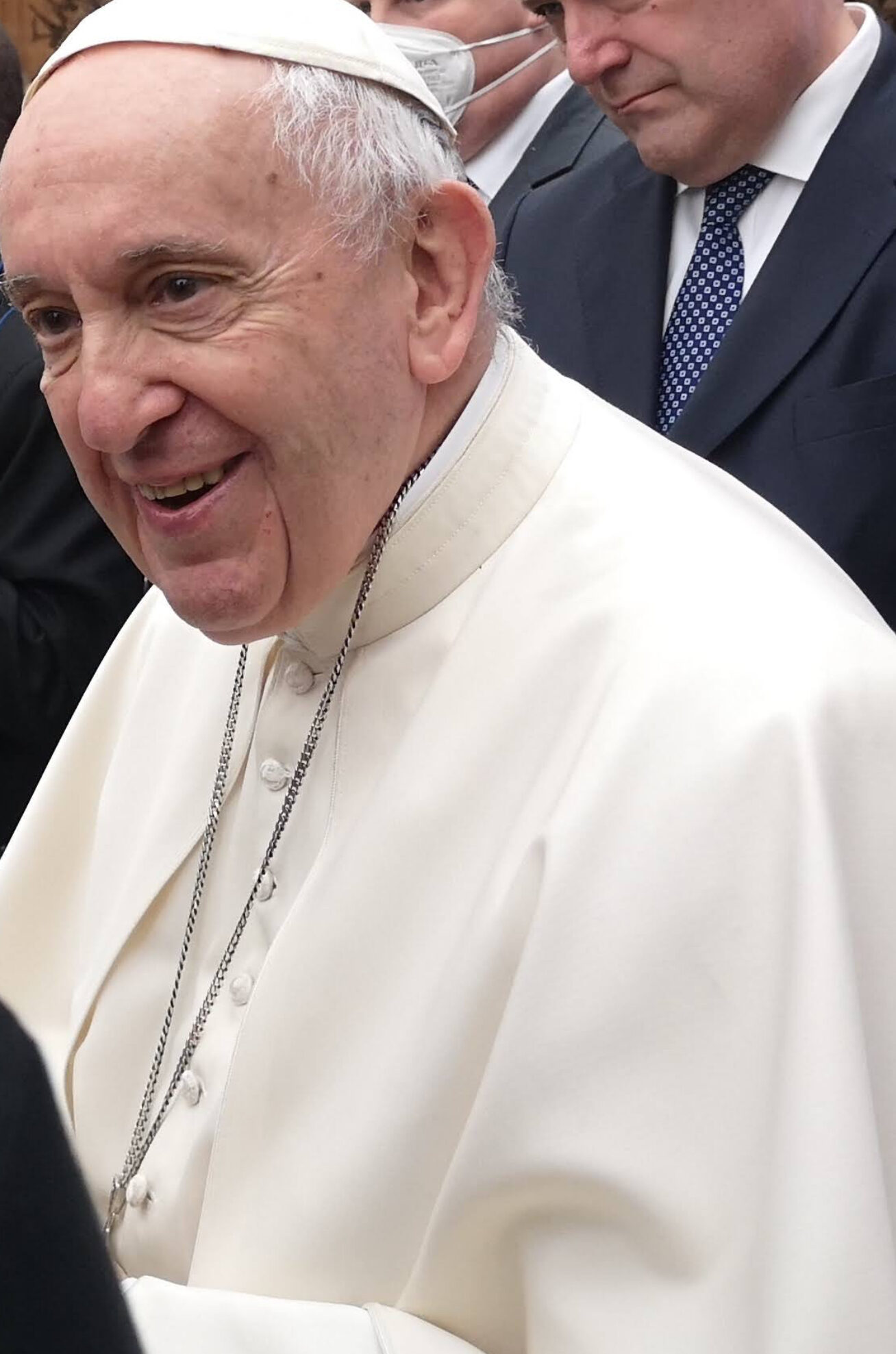 Paven smiler og takker til de som gir gaver. Han legger hånden på noen, og sier noen ord til hver enkelt han hilser på. Han virker overraskende folkelig, der han smiler, ser folk i øynene og lytter til hva de sier.