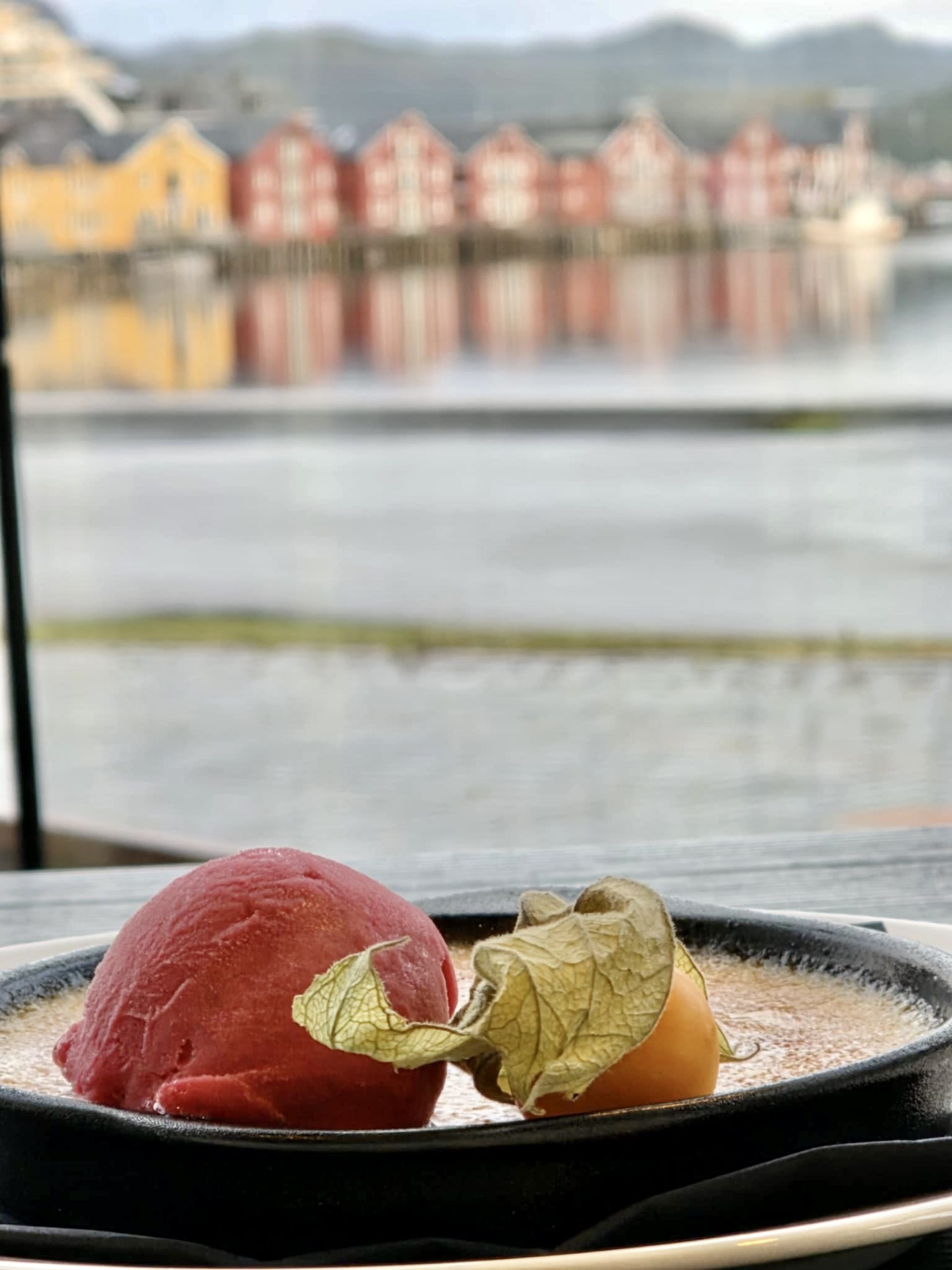 Restauranten i førsteetasjen byr på nydelig utsikt ut mot havepromenaden og fjorden. Det er likevel det heldekkende veggbildet i frokostområdet som fanger oppmerksomheten.