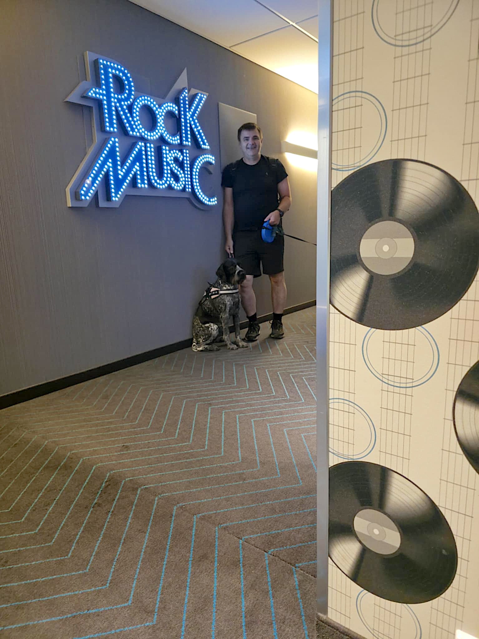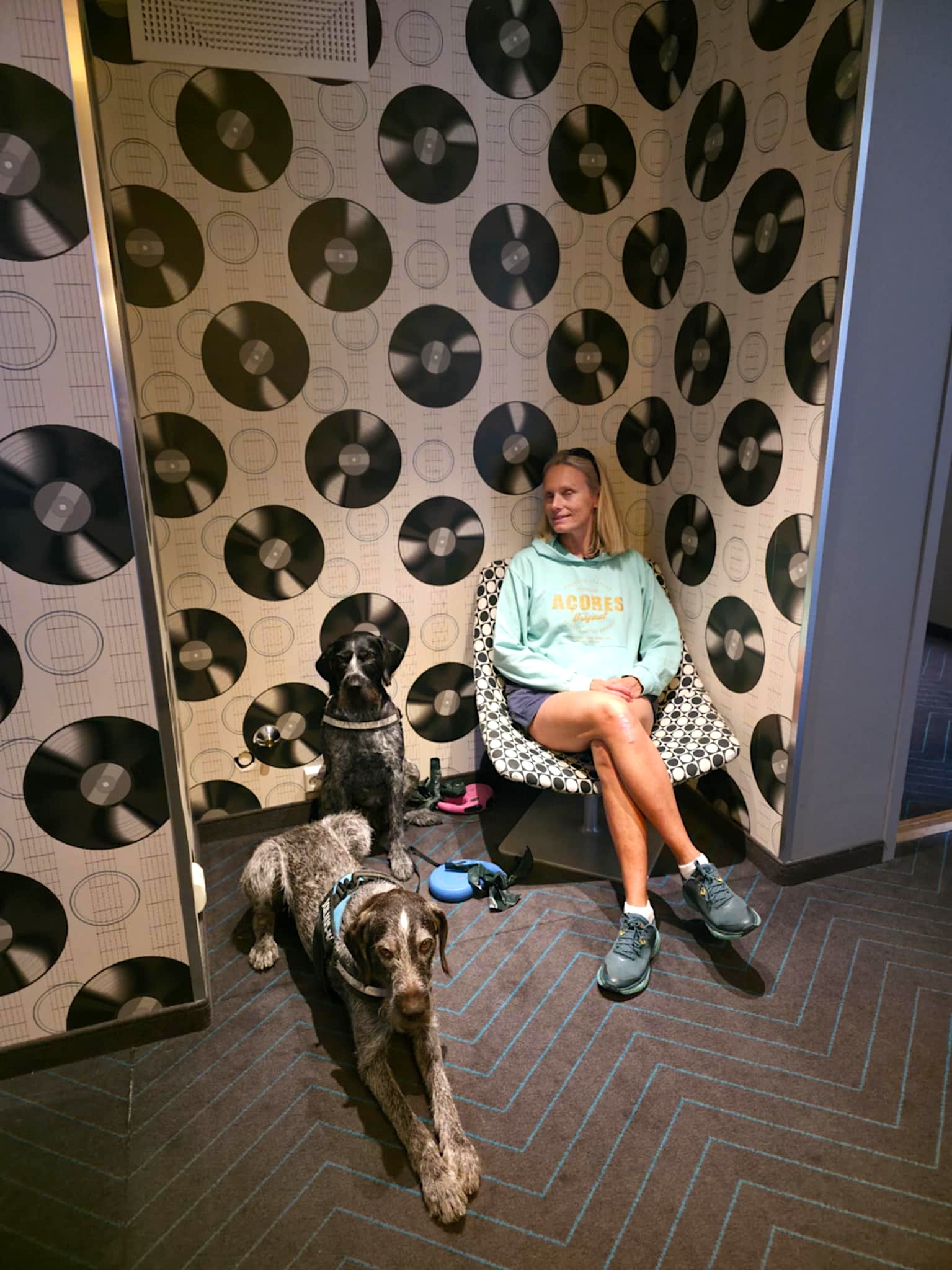 Vi tar heisen opp til etasjen vår, og oppdager at også korridoren har et ikke ubetydelig rockepreg.