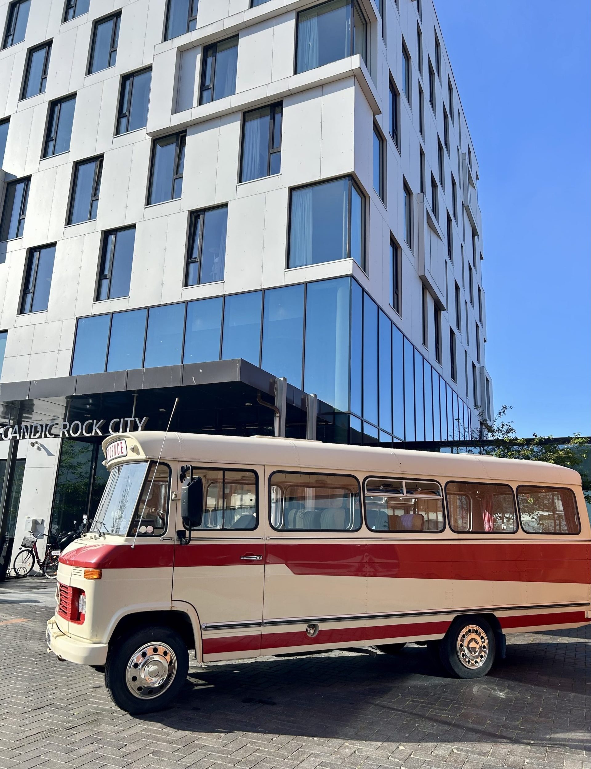 Utenfor hotellinngangen står en rød og kremhvit buss pent parkert, som om den venter på noen inne på hotellet. Men denne rødstripete bussen hører mer hjemme på 70-tallet enn i 2025, og over frontruta leser vi navnet “Prudence”.