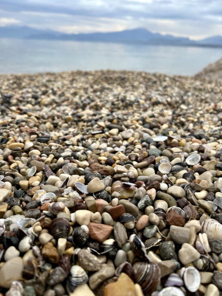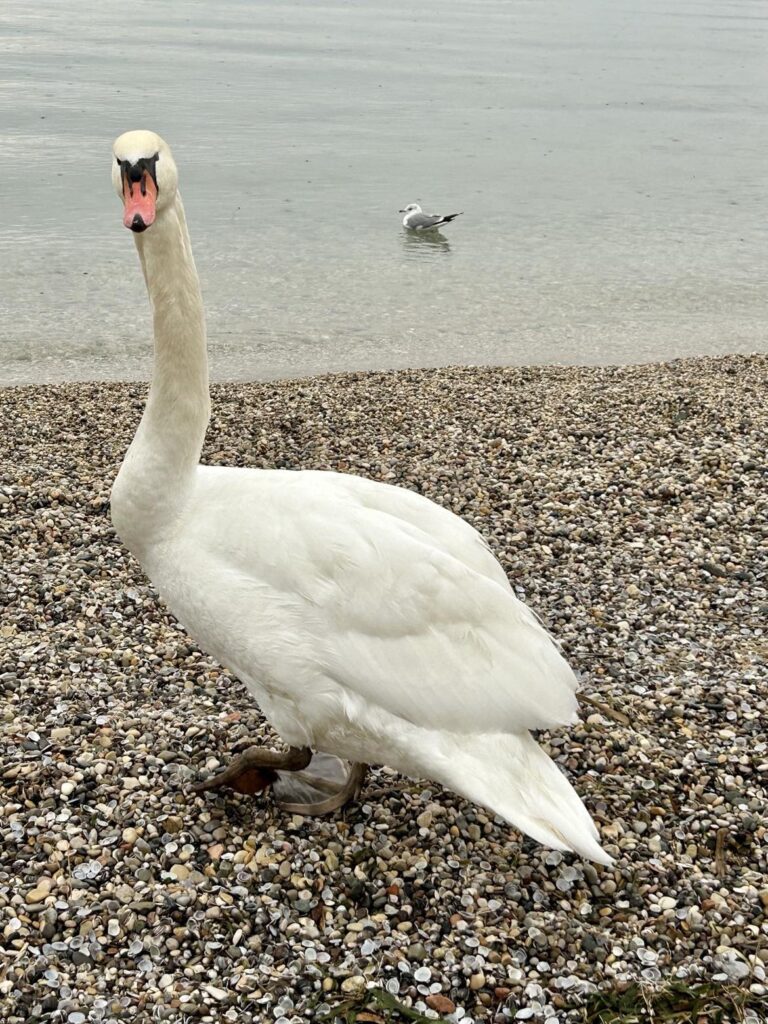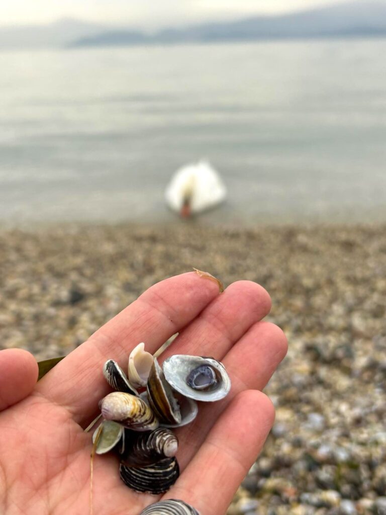 – Og du tror jeg har mat til deg, liksom? erter jeg den fjærkledde hvite skjønnheten. Svanen titter på meg, rister på hodet, snur rumpa til og rister en gang til, og svømmer videre, mens jeg lar meg fascinere av alle skjellene på stranden. Ferksvannsskjell.