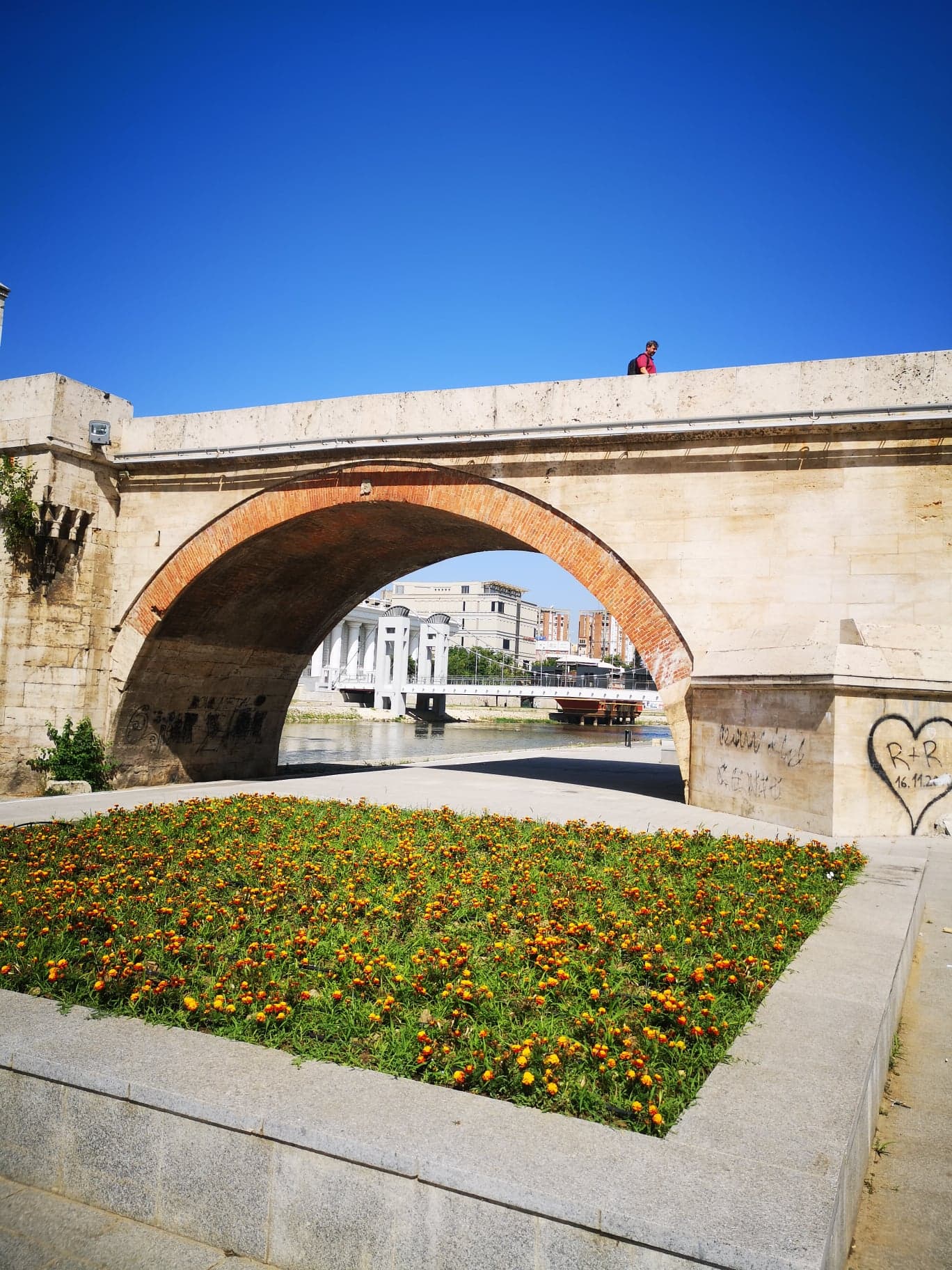 Fra gamlebyen tar det kun noen minutter å gå til Macadonia Square, som ligger på den andre siden av elven Vardar. For å komme til Macedonia Sqaure går man over den gamle steinbroen, som på samme måte som festningen, har fått plass i byflagget.