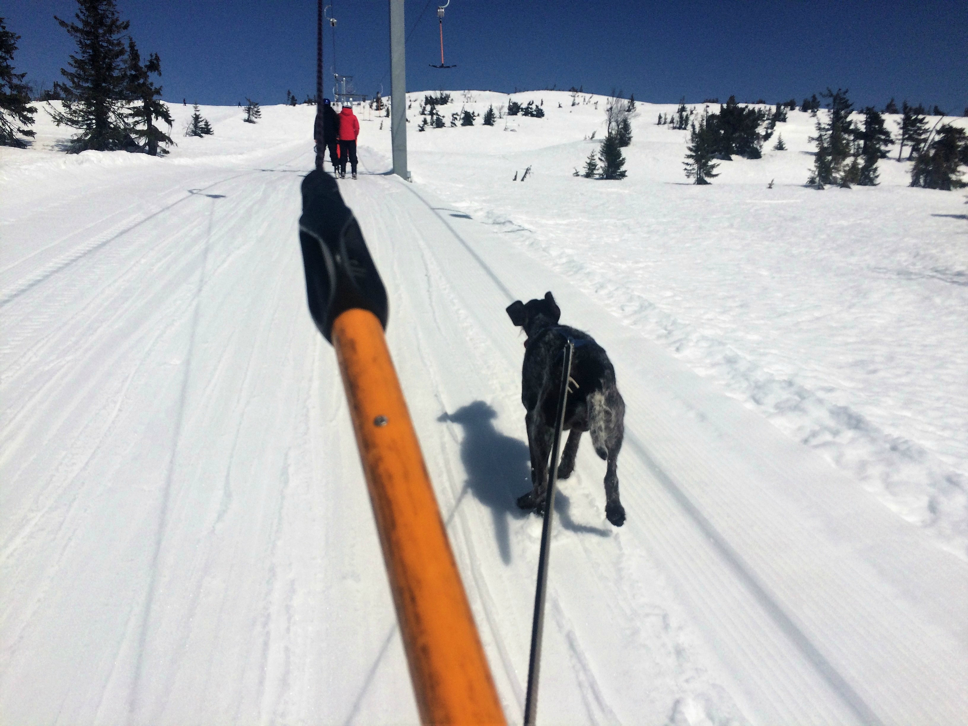 Men kalenderen viser 15.april, og sola skinner fra klar himmel. Kan man annet enn å klage da? Jeg kan tåle mye slit og bakglatte ski i slikt vær. Hunden er som alltid superblid, og benytter hver pause til å ta dobbel salto med skru i snøen.