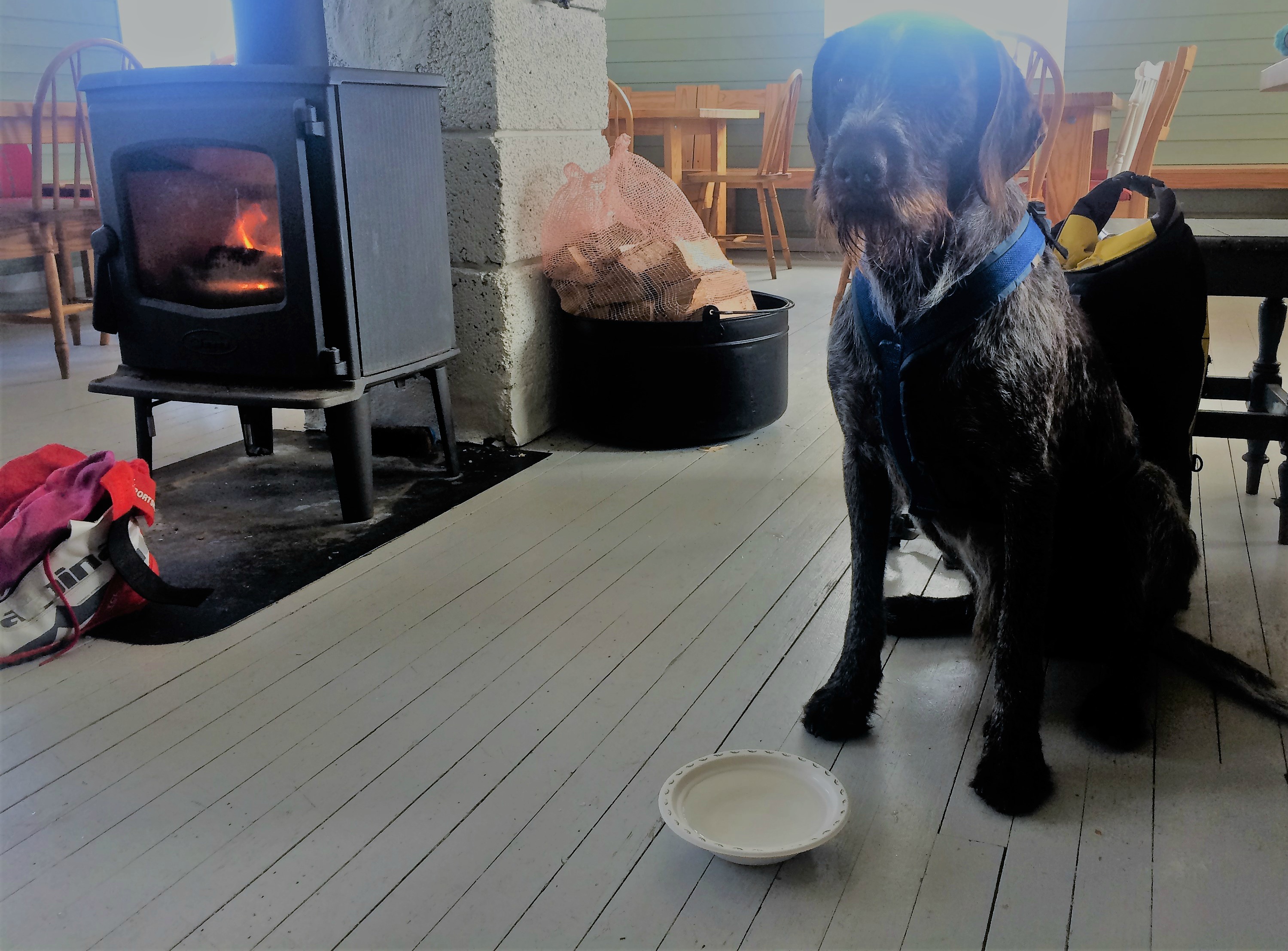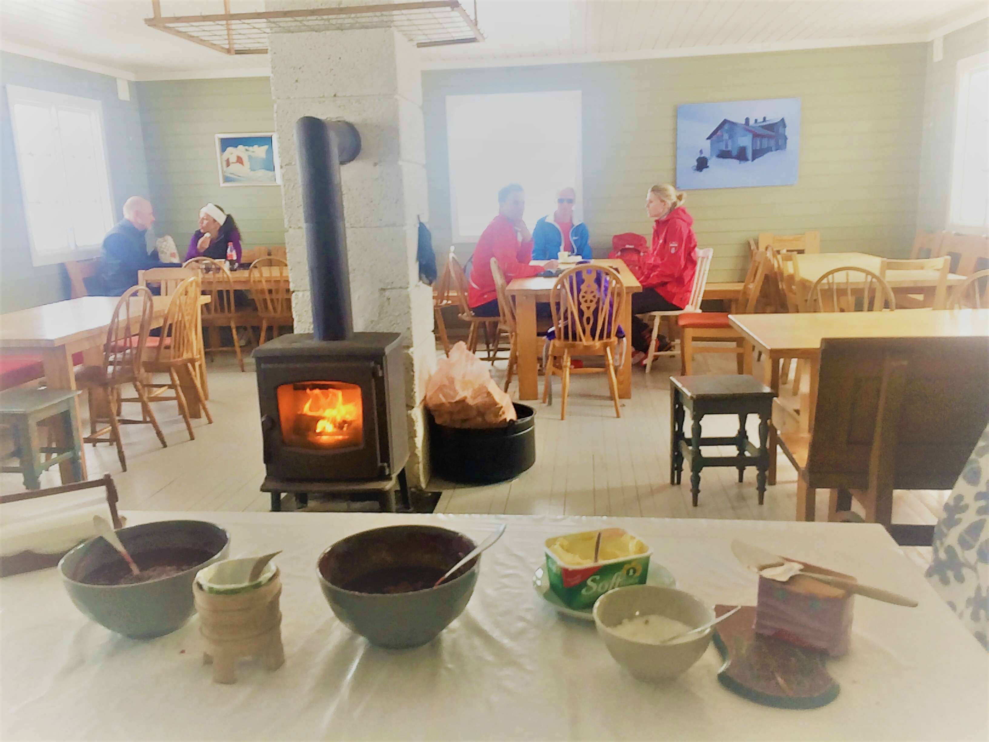 Hyttevert Jarle Huseby serverer kaffe, vafler og pølser. Han inviterer også Tussler inn i peisvarmen, mot at jeg lover å holde hunden unna kjøkkenet, vaflene og bord med mat på. Det er tyve minutter igjen av åpningstiden for vinteren 2018 idet vi stiger inn i varmen og jeg signere i hytteboka for meg selv om min firbente støttekontakt.
