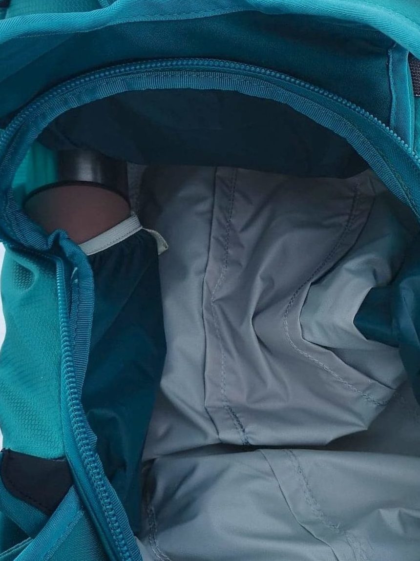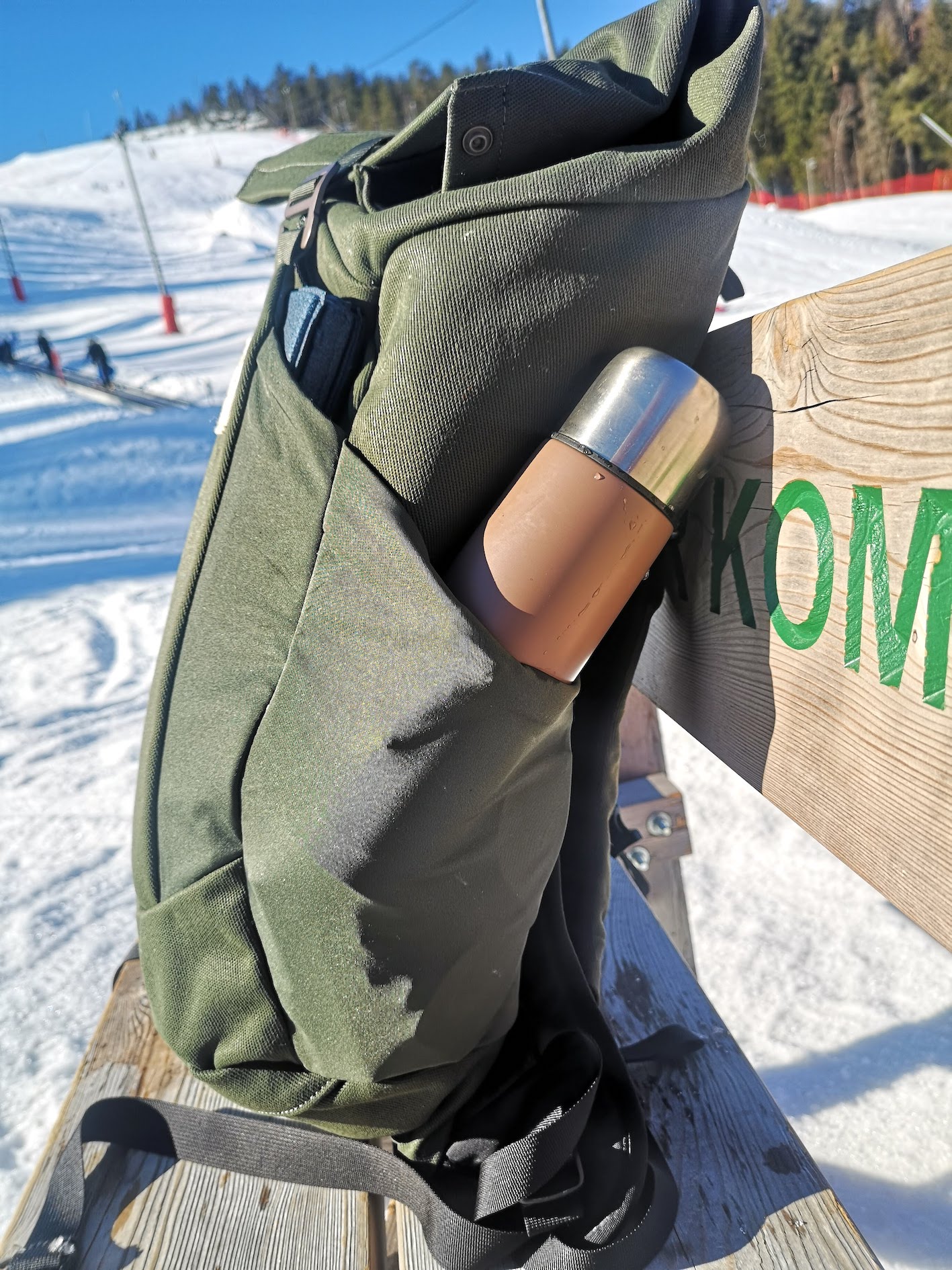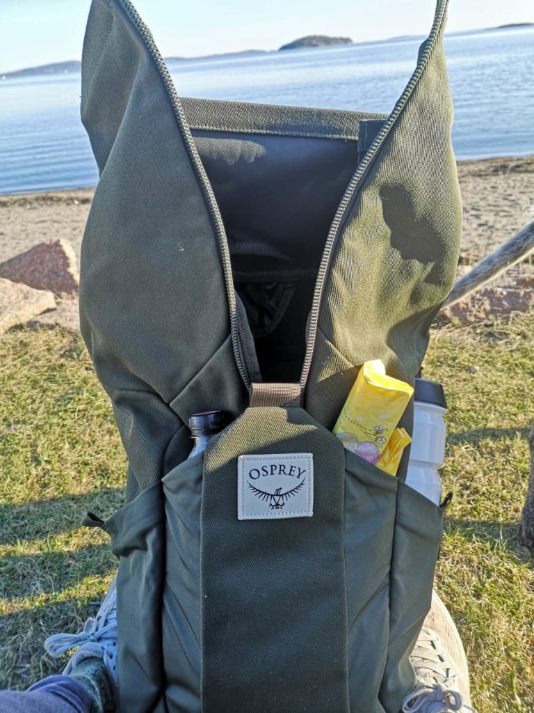 Jeg fant imidlertid ikke noen beholder eller lomme for drikkeflaske, men oppdaget til slutt at denne ligger inne i ryggrommet. Det betyr at jeg må ta av meg sekken og åpne ryggen for å nå drikkeflasken. Hadde jeg kunnet velge, ville jeg hatt flasken på siden utenpå, slik en del av de andre modellene har. Samtidig er det innvendige rommet til drikkeflaske/termos genialt. Hvis jeg kunne velge, ville jeg derfor sagt ja takk til begge deler; både innvendig flaskerom, og hurtigflaskerom som jeg kan nå for kort væskepåfyll uten å ta av meg sekken.