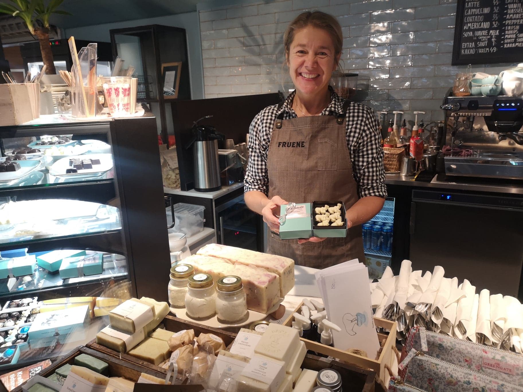 I høstferien var det kø for å komme inn i den populære kafeen Fruene, som i Longyerbyens eneste kjøpesenter. Her selges også hjemmelaget sjokolade, såpe og kremer over disken.