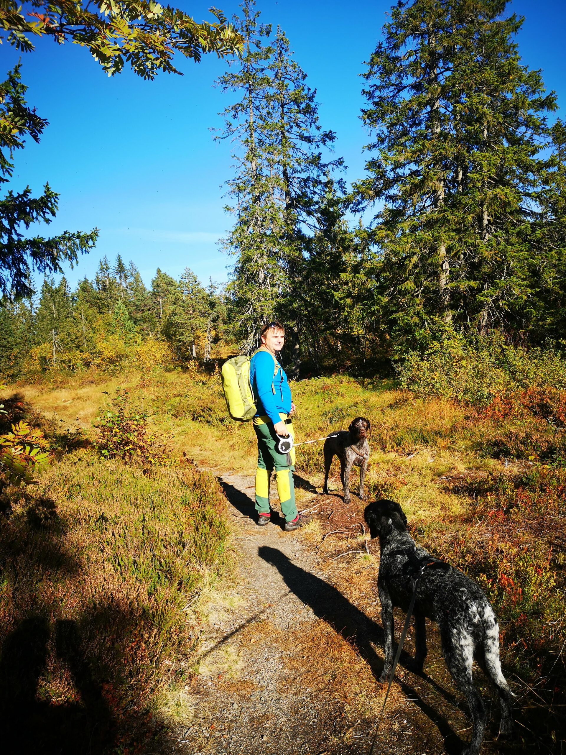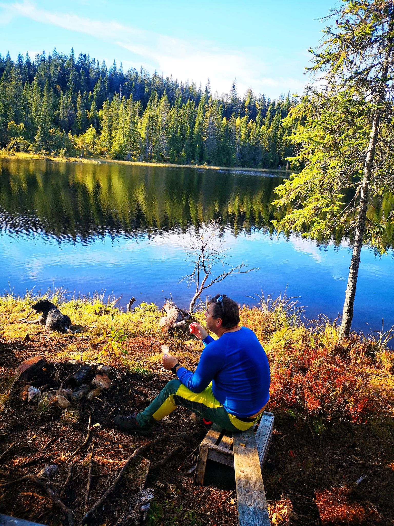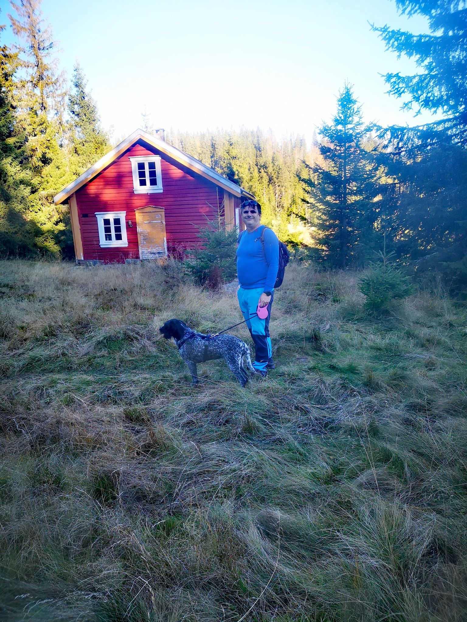 Vi kunne velge mellom sti og grusvei, og endte opp med en kombinasjon gjennom grus, lyng, skog og myrlandskap. Vel framme på Darrebu møtte vi to hyggelige representanter fra DNT som holdt på med oppgradering av hytta. De tipset oss om å følge stien videre opp til et lite vann, ettersom undertegnende og våre to firbente var varme og klare for et friskt skogsbad før vi startet på tilbaketuren.