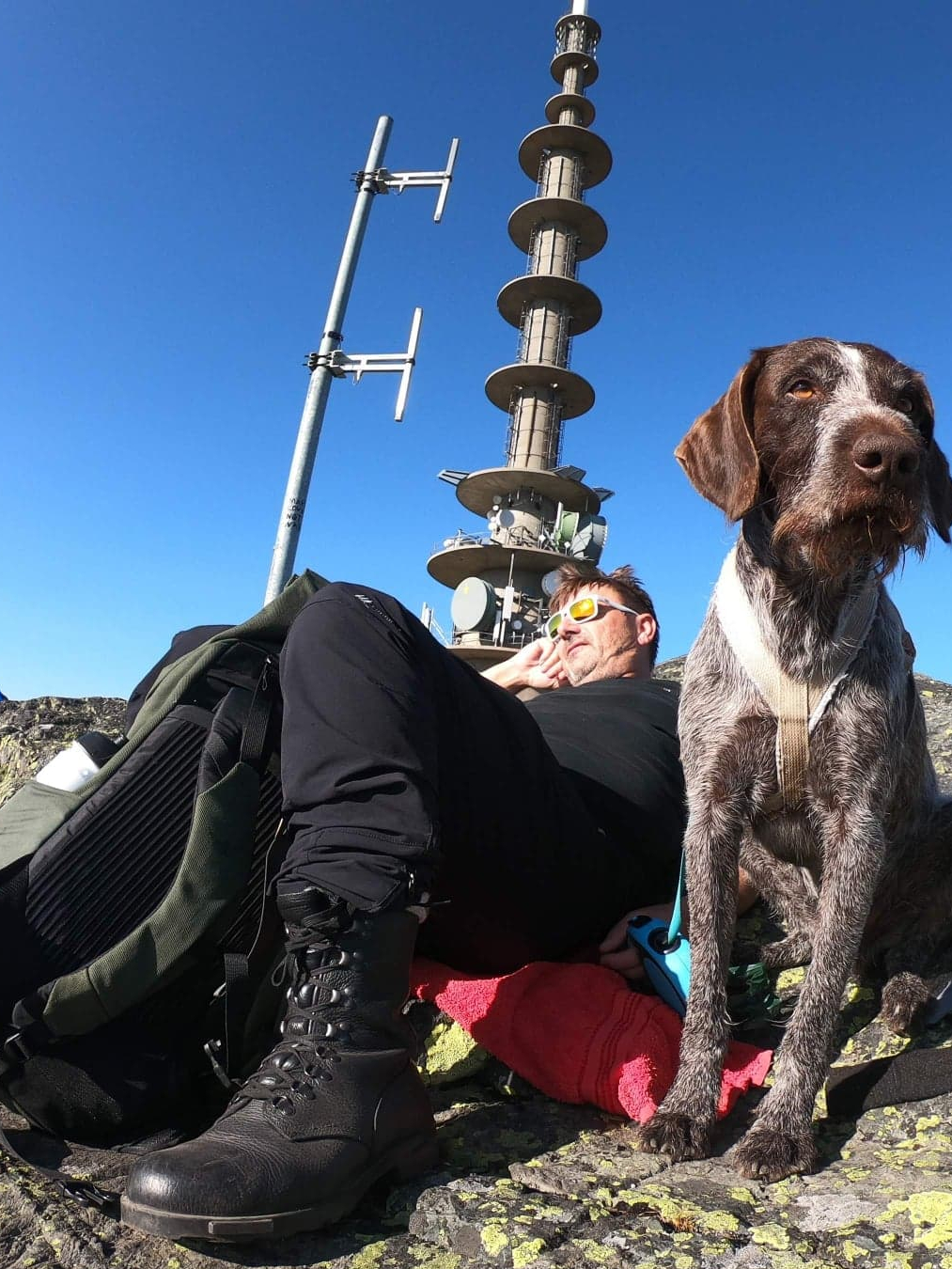 Vi bruker rundt en time på turen fra parkeringsplassen til toppen, inkludert flere stopp underveis. Vi tar oss tid til å å se oss rundt, sjekke ut status på noen gamle steinsopper og la hundene få seg et bad i det lille vannet vi passerer før den siste stigningen opp til toppen.