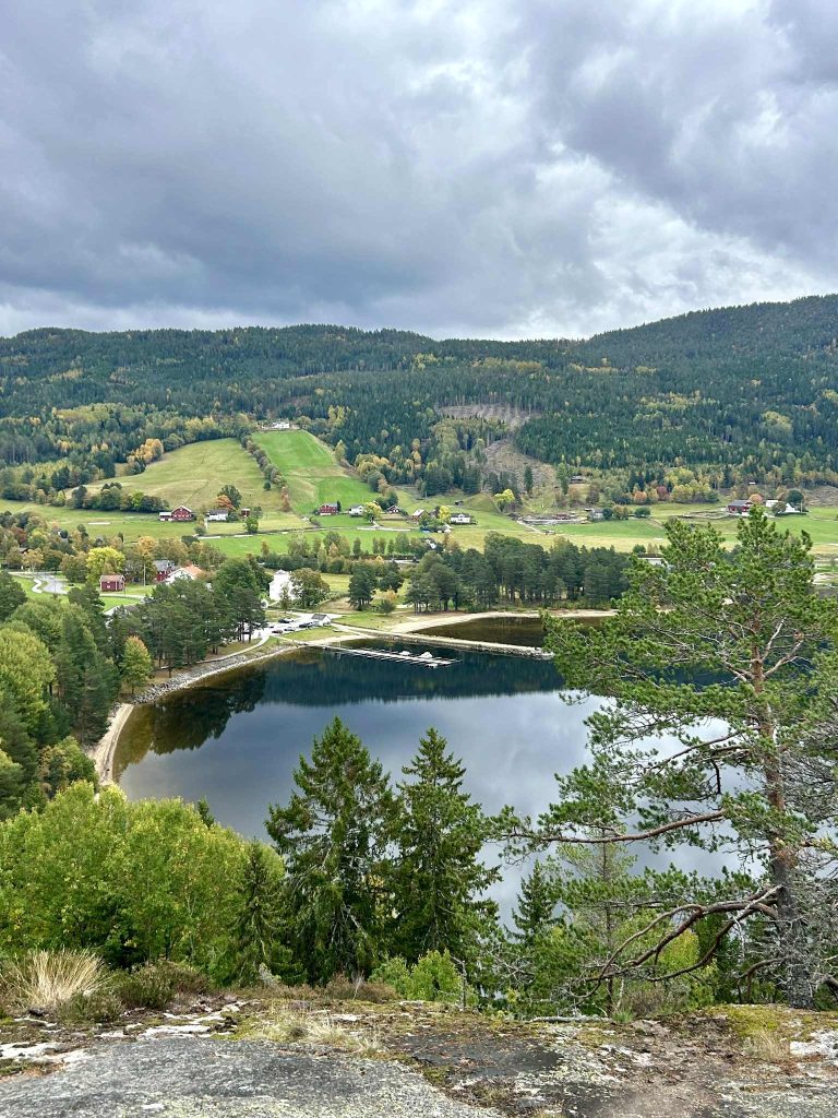 Vi er ved veis ende på Tretoppvegen, og forsetter ut på fjellknausen lengst ut på Hamaren. Her har vi utsikt over innsjøen, de speilblanke fjellene i nordvest og bygda med de grønne åsene i sørøst.